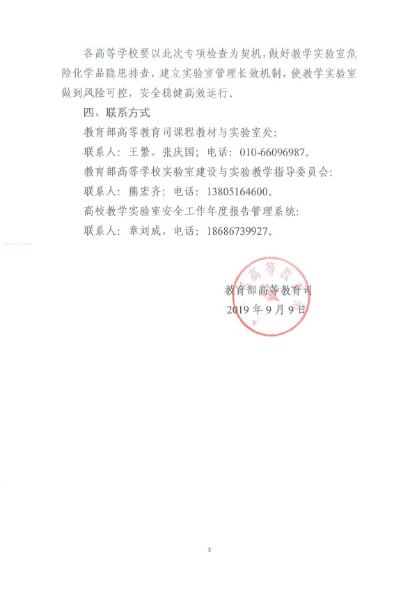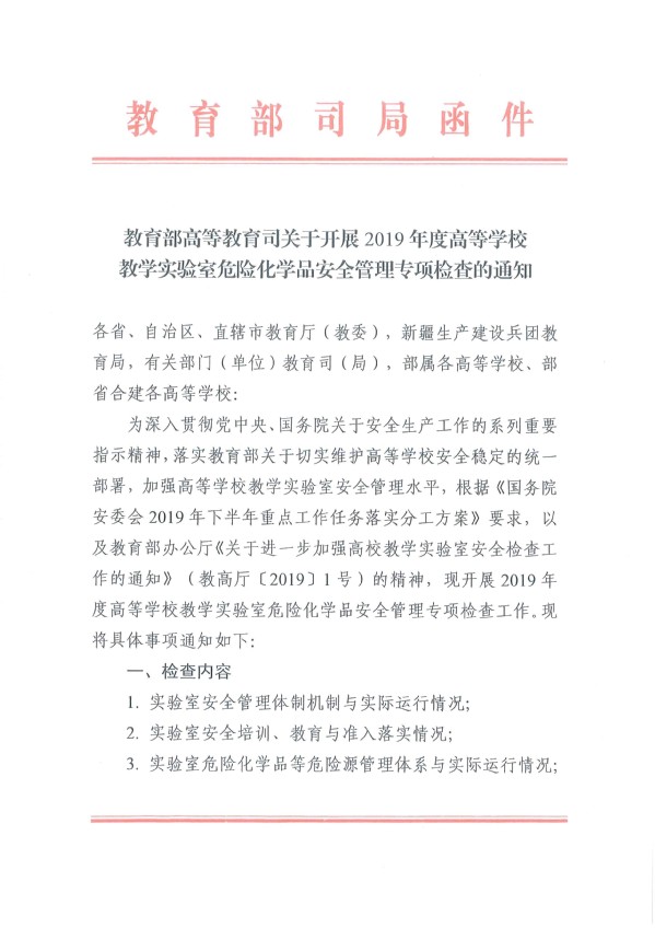 教育部高等教育司BETVLCTOR伟德官方网站开展2019年度高等学校教学实验室危险化学品安全管理专项检查的通知